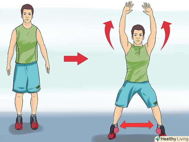 Виконуйте різножку (стрибки на місці зі зміною положення рук і ніг), 5-15 хвилин. поставте ноги разом і витягніть руки вздовж тіла. Стрибніть вгору, розведіть ноги і підніміть руки над головою. Поверніться у вихідне положення і повторіть. [11]- Як і у випадку зі скакалкою, робіть паузи, якщо втомитеся, і поступово збільшуйте тривалість тренування.