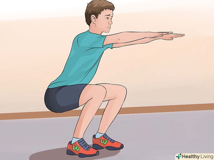 Зміцнюйте м'язи ніг за допомогою присідань. Станьте, поставте ноги на ширину плечей, злегка розведіть шкарпетки, випряміть спину, витягніть руки уздовж тіла або схрестіть на грудях. Не згинаючи тулуб і не розслабляючи м'язи кора, зігніть ноги в колінах і опустіться вниз, як ніби хочете сісти на стілець. [20]- Відведіть сідниці назад, щоб вага перейшов в п'яти. Шкарпетки повинні бути паралельні колін. Не виводьте коліна за ступні.
