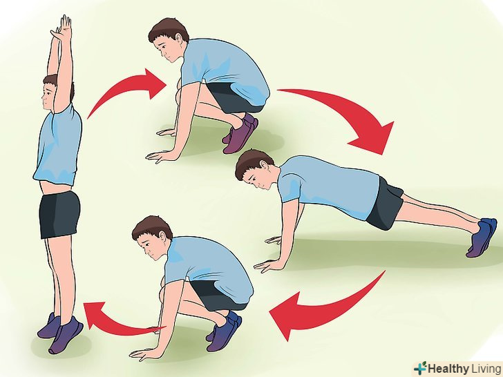 Спробуйте робити вправу Берпі, щоб дати навантаження на все тіло. поставте ноги на ширину плечей, стрибніть вгору і опустіться на підлогу. Упріться долонями в підлогу і витягніть ноги назад, відіжміться один раз. [21]- Після віджимання підтягніть ноги до себе, стрибніть вертикально, витягнувши руки вгору, і поверніться у вихідне положення. Виконайте 2 підходи по 12 повторень.