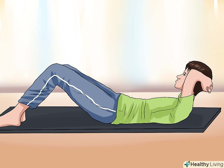 Опрацюйте м'язи живота за допомогоюСкручувань . ляжте на спину, зігніть ноги в колінах і поставте ступні на підлогу. Схрестіть руки на грудях або підкладіть під голову. Напружте м'язи живота і підніміть тулуб над підлогою на видиху. [18]- Піднімайте тулуб до тих пір, поки плечі не відірвуться від підлоги. Затримайтеся на 1-2 секунди, потім на видиху опустіться на землю. Виконайте два підходи по 12 повторень.