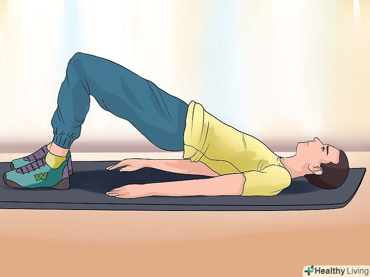 Опрацьовуйте сідничні м'язи і м'язи кора за допомогою сідничного містка. ляжте на спину, зігніть ноги в колінах, поставте ступні на підлогу, витягніть руки уздовж тіла. Зробіть вдих, потім зробіть видих, напружте м'язи кора і повільно підніміть стегна і нижню частину спини. Піднімайте тіло до тих пір, поки плечі і коліна не сформують пряму лінію. Не відривайте руки від підлоги, щоб не втратити рівновагу. [19]- Затримайтеся у верхній точці на 1-2 секунди, потім зробіть вдих і повільно опустіться у вихідне положення. Виконайте 2 підходи по 12 повторень.