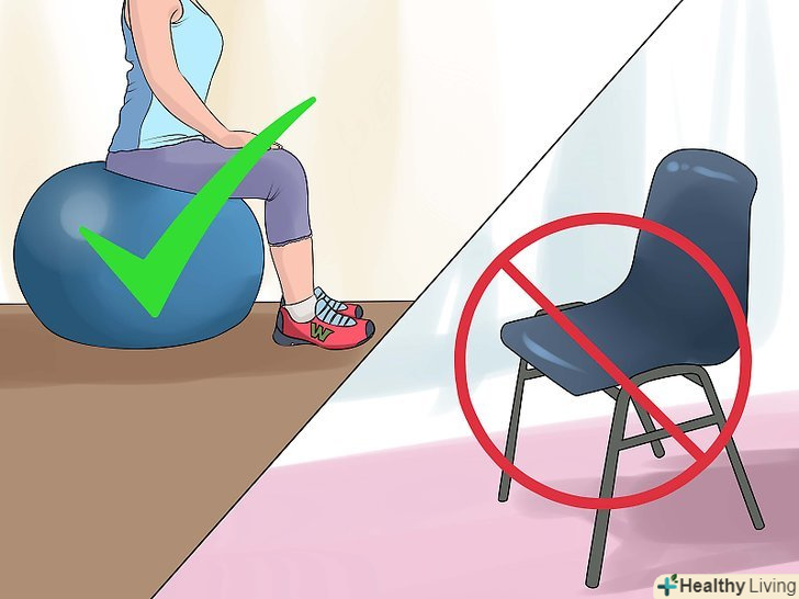 Намагайтеся менше сидіти. Сидячий спосіб життя шкідливий для здоров'я. Спробуйте використовувати стіл, за яким треба стояти, а не сидіти, або встановити столик для комп'ютера на бігову доріжку. Якщо це вам не підходить, намагайтеся частіше вставати і ходити. [30]- Спробуйте сидіти на фітболі замість стільця. Вам доведеться використовувати м'язи кора, щоб утримувати себе на м'ячі, тому вони будуть працювати практично весь час.
