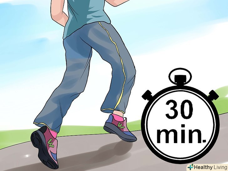 ПочнітьХодити швидким кроком або бігати кожен день. біг і ходьба допоможуть вам більше рухатися, особливо якщо ви тільки починаєте займатися спортом. Можна 15 хвилин походити в обідню перерву, а потім походити або побігати ще 15 хвилин після вечері. [9]- Якщо ви у віці або у вас є проблеми з суглобами, біг буде шкідливий для колін, стегнових суглобів і щиколоток. Знайте обмеження свого організму і, якщо буде потрібно, замініть БІГ ходьбою.