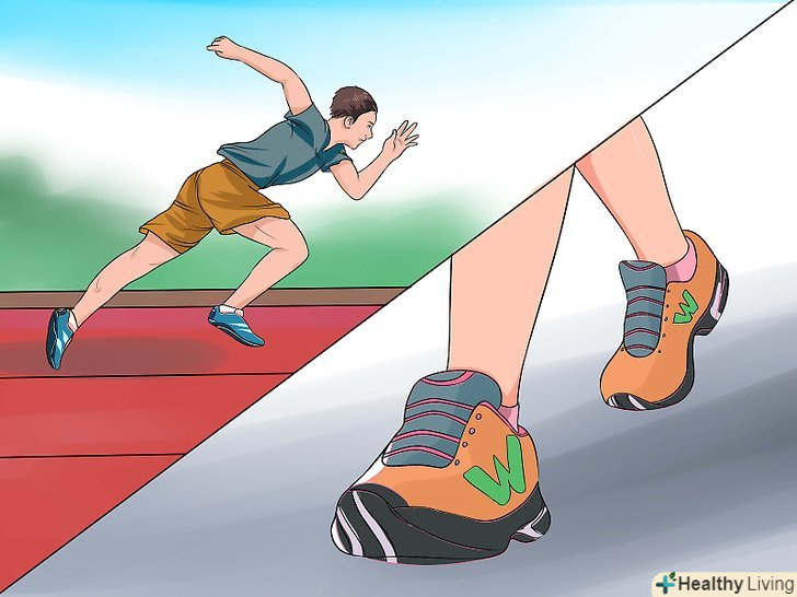 СпробуйтеІнтервальні тренування . під час інтервальних тренувань чергуються високо - і низькоінтенсивні вправи, що дозволяє спалювати багато калорій. Оскільки в інтервальних тренуваннях використовуються високоітенсівние вправи на зразок бігу, важливо включити їх в свій режим, якщо ви вже займаєтеся спортом якийсь час. Прикладом інтервального тренування може служити чергування бігу і ходьби. [15]- Щоб розігрітися, пройдіться швидким кроком 5-10 хвилин, потім побігайте 5-10 хвилин. Потім перейдіть на швидкий біг на 30-60 секунд, потім скиньте швидкість і біжіть 5 хвилин. Чергуйте швидкий біг 30-60 секунд з 5 хвилинами повільного бігу 2-3 рази. Потім перейдіть на крок на 5-10 хвилин, щоб охолонути.