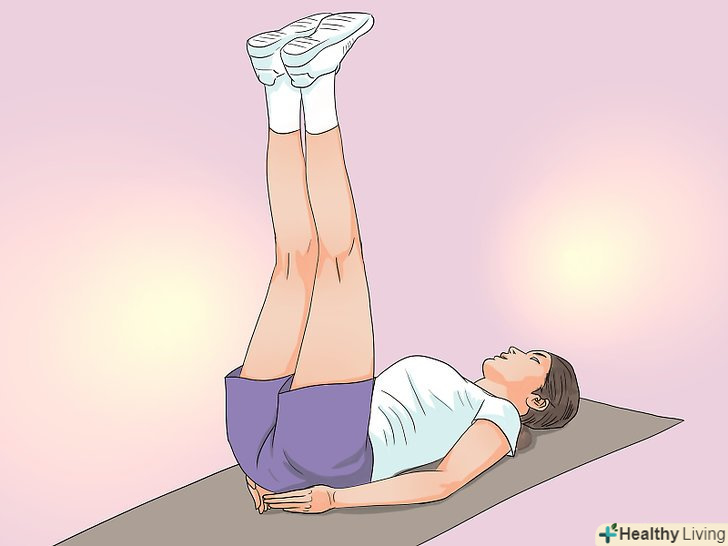 Зробіть піднімання ніг. це відмінно підходить для опрацювання м'язів живота! А ще це непогано для розтяжки. Ляжте на спину, руки покладіть під попу, лікті зігнуті. Підніміть ноги прямо над собою, як буква 'L'. Виштовхуйте ступні до стелі, відриваючи стегна і попу від підлоги (за допомогою преса). Поверніться в початкове положення. Виконайте 15 повторень.