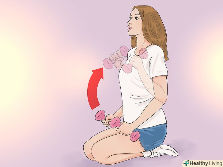 Надайте сили рукам. Сядьте на коліна, тримаючи спину рівно. У кожній руці тримайте 2 кг ваги. Доторкніться ліктями до зап'ястя. Підніміть вагу, згинаючи лікті вгору, поки вага не торкнеться ваших плечей. Повільно опустіть гантелі або пляшки. Повільне виконання допоможе швидше сформувати м'язи. Зробіть 3 підходи по 20 разів.