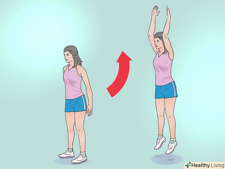 Надайте сили ногам. Встаньте, поставивши ноги ширше, ніж на ширину плечей, щоб відстань між ними було побільше, але вам все ще було зручно. Для цієї вправи вам не знадобляться ваші обважнювачі (якщо тільки ви не хочете поставити перед собою непросте завдання). Напружте прес (м'язи живота) і стрибніть. Приземліться на зігнуті ноги, стопи разом. Щоб не пошкодити коліна, постарайтеся приземлятися м'яко на пальчики, як кішка. Повторіть 3 підходи по 15 разів.