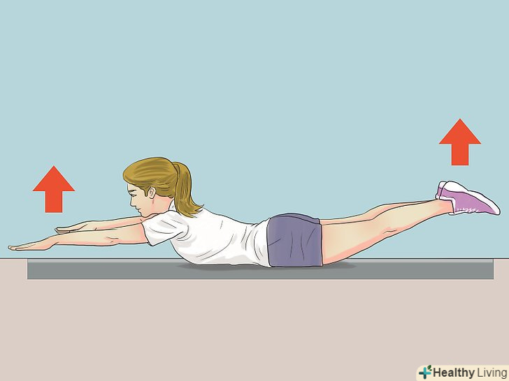 Попрацюйте над спиною. ляжте на живіт. Витягніть руки прямо перед собою, а ноги будуть позаду вас. Піднімайте руки і ноги від підлоги. Тримайте від 30 секунд до 2 хвилин, поступово збільшуючи цей час. Щоб домогтися красивого тіла, стискайте м'язи попи! Зробіть всього 3 рази.