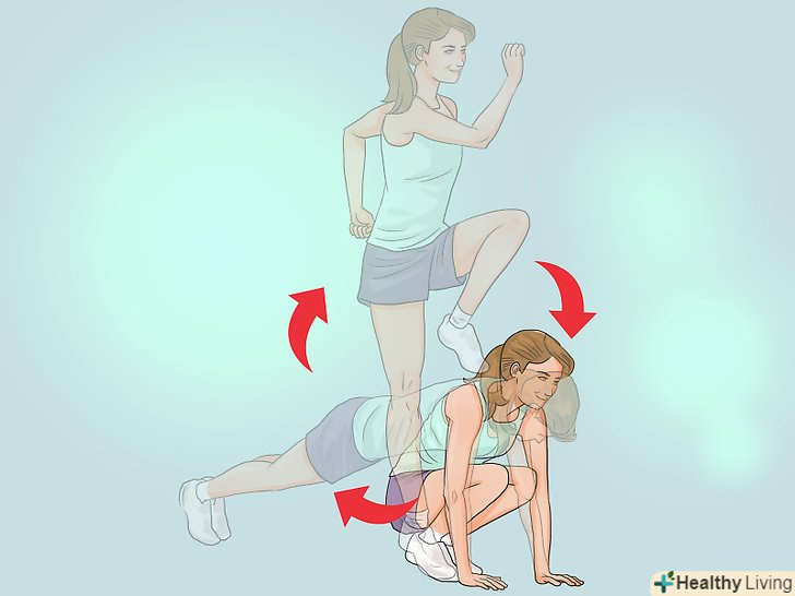 Виконайте біг на місці з підніманням колін. цей рух корисно для ніг, плечей, попи і преса. Витягніть руки прямо перед собою. Біжіть на місці, високо піднімаючи коліна (колінами торкаючись до рук) 10 секунд. Присядьте в позицію 'жаби'. Ноги ззаду, щоб Ви були в позиції, як для віджимання. Вистрибуйте в початкове положення. Виконайте вправу мінімум 15 разів. Це повинно бути одним рухом.