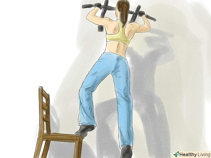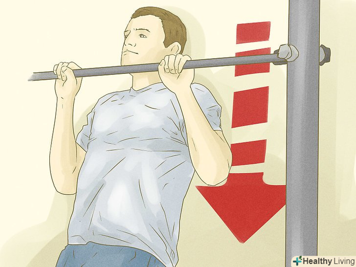 Виконуйте Зворотні підтягування. припустимо, у вас при собі немає ніяких засобів підтримки, але вам все одно не терпиться почати підтягуватися, то виконайте наступне: застрибніть на турнік якомога вище, щоб ваш підборіддя виявився вище поперечини, потім намагайтеся протриматися вгорі якомога довше, борючись з законом всесвітнього тяжіння. Але будьте обережні при виконанні цієї вправи.- ви можете або застрибнути на поперечину, або залізти на неї за допомогою стільця, але в будь-якому випадку вам знадобиться зберігати контроль при опусканні вниз. Ви можете або опускатися дуже повільно і зробити всього одне повторення, або опускатися вниз досить швидко протягом 3 секунд, зробивши більшу кількість підходів, – вирішувати вам.