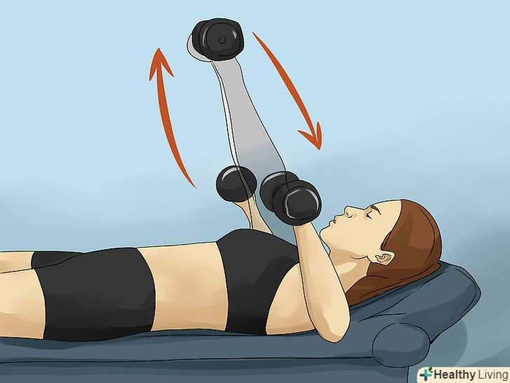 Почніть з легких ваг і збільшуйте їх у міру того, як ваша сила буде зростати. робота з занадто великими вагами може призвести до травми. Необхідно також навчитися правильно виконувати кожну вправу, перш ніж підвищувати навантаження. [10]- Слідкуйте за правильним виконанням кожної вправи: рухайтеся повільно, розмірено дихайте і дотримуйтесь діапазон рухів. Якщо ви будете поспішати або порушувати діапазон рухів, то ризикуєте отримати травму.