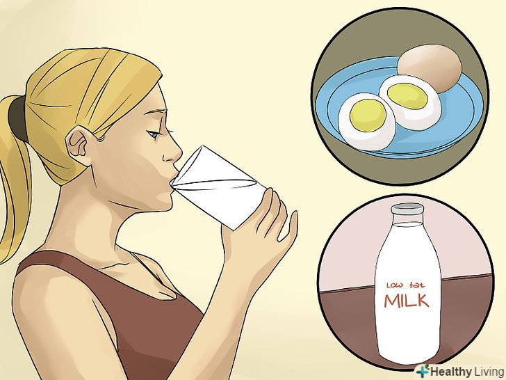Вживайте нежирне молоко і яйця. ці багаті поживними речовинами продукти також необхідні для нарощування і підтримки м'язової маси. Крім того, молочні продукти допомагають зміцнити кістки в дитячому та підлітковому віці. [36]- Доповніть свій раціон нежирним сиром. Сир є корисним десертом, особливо в поєднанні зі свіжими ягодами. Крім того, він містить білок, який повільно перетравлюється і ідеально підходить для підтримки м'язів. [37]