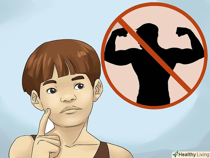 Не займайтеся пауерліфтингом і не беріть участь в змаганнях з важкої атлетики. Діти та підлітки не повинні брати участь у змаганнях з важкої атлетики, пауерліфтингу або бодібілдингу. Ці види спорту припускають дуже жорстке нарощування м'язової маси, у них дуже високий ризик отримання травм, тому вони не годяться для дітей. [11]- Якщо ви не знаєте, які види силових вправ слід виконувати вам або вашій дитині, проконсультуйтеся з лікарем.