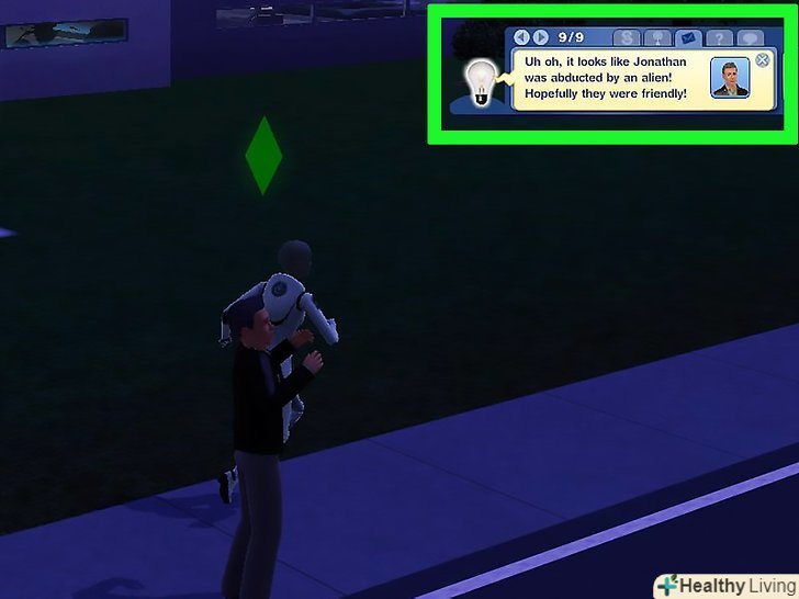Зробіть Сіма жертвою викрадення прибульців .чоловічі персонажі молодого віку і старше можуть бути викрадені прибульцями, при цьому існує один шанс з трьох, що після викрадення персонаж завагітніє. Дитина в такому випадку буде стовідсотковим прибульцем і без родинних зв'язків з батьком. Щоб влаштувати викрадення прибульцями вам буде потрібно виконати нижчевказані дії.- Встановіть Доповнення"сезони".