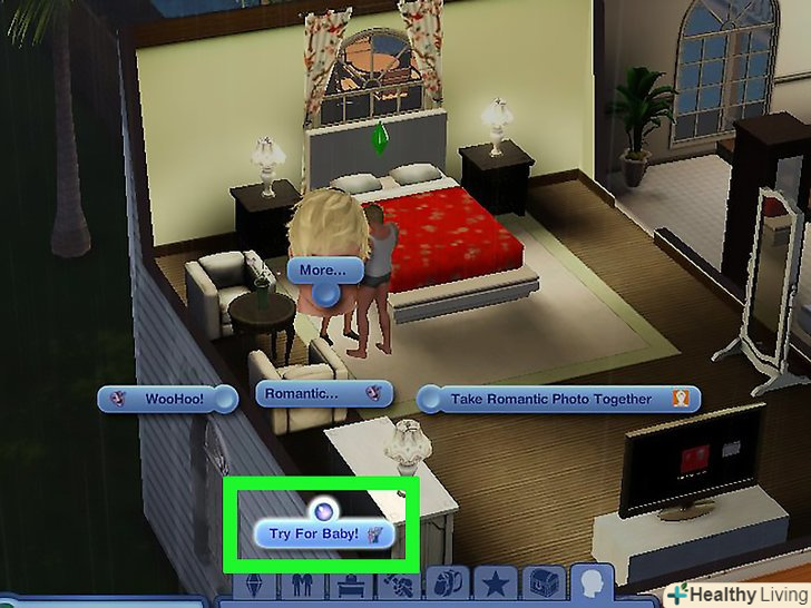 Спробуйте зачати дитину.після переходу романтичного спілкування в третю стадію виберіть у вкладці " Романтика "опцію"зачати дитину". Пара коханих переміститься на відповідний об'єкт і непогано розважиться під прикриттям вбудованої в гру цензури.- У вас не буде можливості завести дитину, якщо ви вже керуєте вісьмома персонажами.