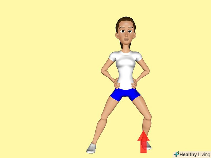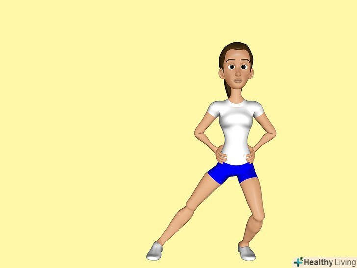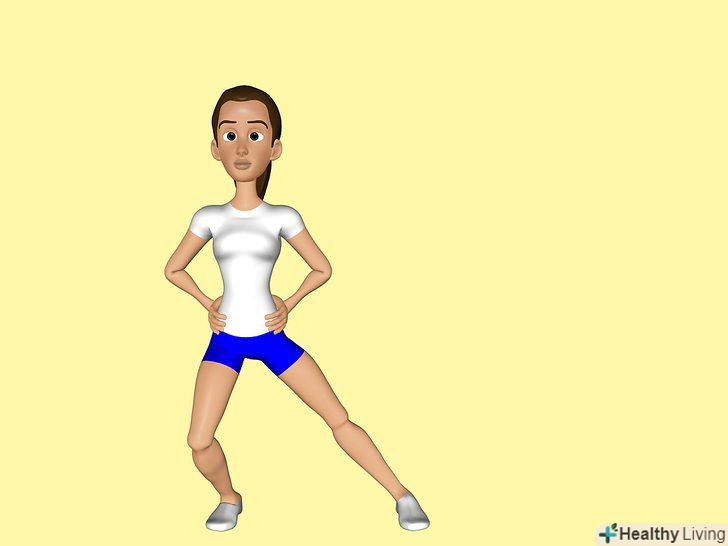 Стоячи обличчям вперед, висуньте праву ногу приблизно на два фути (60 см) вправо. зігніть праву ногу, переміщаючи на неї вагу; ваша ліва нога повинна залишатися прямою. Тримайте обидві ноги у напрямку руху, а руки на стегнах.