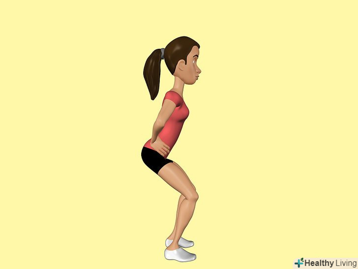 Зігніть коліна, щоб вони були на одній лінії з пальцями ніг, як ніби ви збираєтеся сісти на стілець. Тримайте п'яти притиснутими до підлоги, і висувайте попу. Не забудьте тримати спину прямо: нахилившись вперед під час присідання, ви створите навантаження на спину.