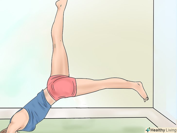 Виштовхніть ліву ногу вгору і вперед. ваша вага трохи зміститься при переході в розтяжку. Будьте обережні і не поспішайте, щоб не втратити рівновагу.- Попросіть друга підстрахувати вас під час виконання даного елемента на перших порах, щоб виключити можливість падіння в разі втрати рівноваги.