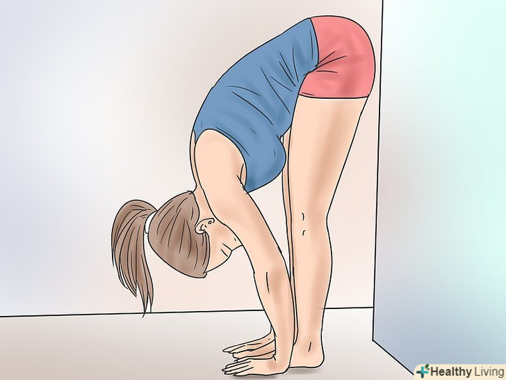 Опустіть тулуб вниз, пригорнувши животом до стегон. розташуйте руки на підлозі і частково перенесіть вагу тіла на руки.