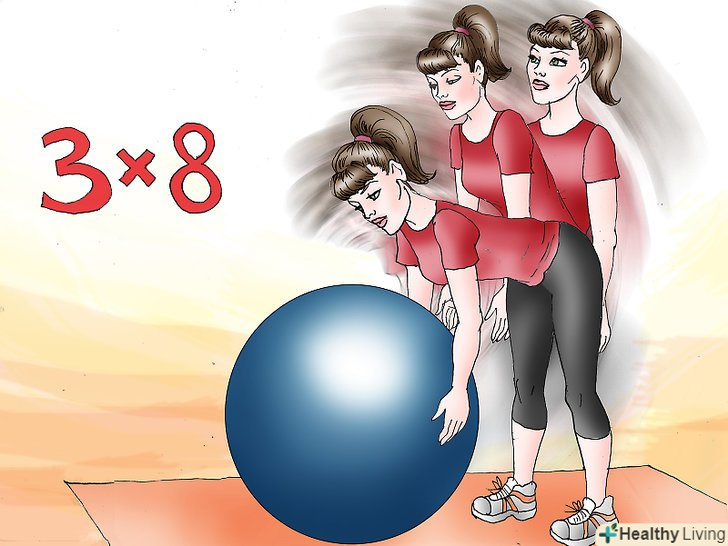 Виконайте вправу в три підходи по 8 повторів. продовжуйте нахилятися і випрямлятися з м'ячем ще 8 разів. Відпочиньте 30 секунд. Потім зробіть ще 8 повторів. Потім відпочиньте ще 30 секунд і виконайте ще 8 повторів.