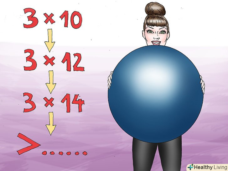 Поступово збільшуйте кількість повторів. коли 3 підходи по 8 повторів стане для вас занадто легким вправою, збільште число повторів до 10, а потім до 12, коли ви будете готові до цього. У міру того, як Ваші м'язи будуть міцніти, ви виявите, що це досить легка вправа.