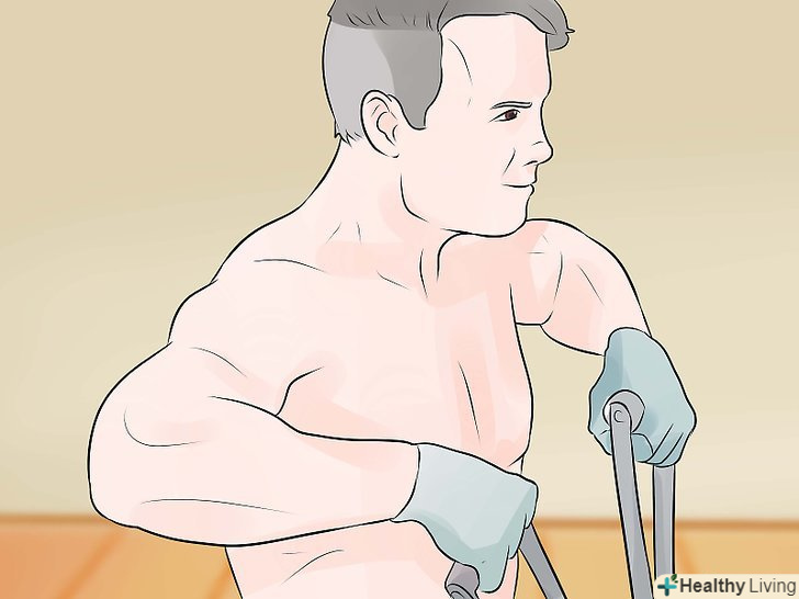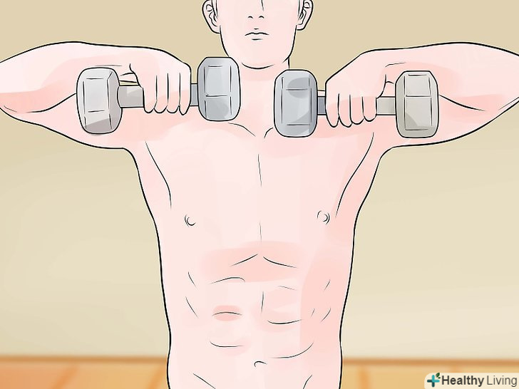 Робіть вертикальну тягу. Встаньте рівно і візьміть дві гантелі, по одній в кожну руку. Тримайте гантелі перед собою, паралельно стегнах. Згинаючи руки в ліктях, підніміть гантелі до грудей. Гантелі при цьому тримайте паралельно один одному, імітуючи гребок двома веслами. Повільно опустіть гантелі вниз до стегон і зробіть 10 повторень. [2]