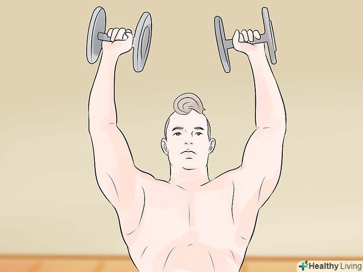 Робіть вертикальну тягу гантелями. візьміть в кожну руку по гантелі і встаньте ноги на ширині плечей. Зігніть руки в ліктях і підніміть гантелі до плечей і потім підніміть вагу безпосередньо над головою. Повільно опустіть гантелі вниз на плечі і повторіть вправу.