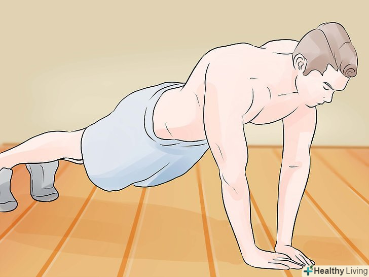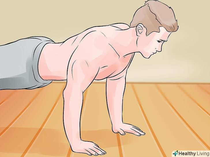Робіть стандартні віджимання. віджимання надає хороший рельєф грудей, рук і плечей. І все, завдяки одній вправі. Ляжте на живіт і руками відштовхуйтеся від підлоги, стаючи на носочки. Повільно опускайтеся на підлогу так, щоб руки згиналися під кутом 90 градусів. Повторіть вправу; якщо вправа занадто складне, встаньте на коліна і віджимайтеся не з шкарпеток, а з колін. [7]