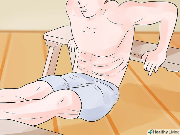 Робіть віджимання від лави. у цій вправі вам потрібно поставити руки на одну лавку, а ноги на іншу. Ваше тіло як Міст між двома лавками. Розвернувшись горілиць, на руках опускайтеся нижче рівня лавки і потім, виштовхуйте себе у вихідну позицію. Щоб збільшити складність вправи, віджимайтеся з вагою на ногах.