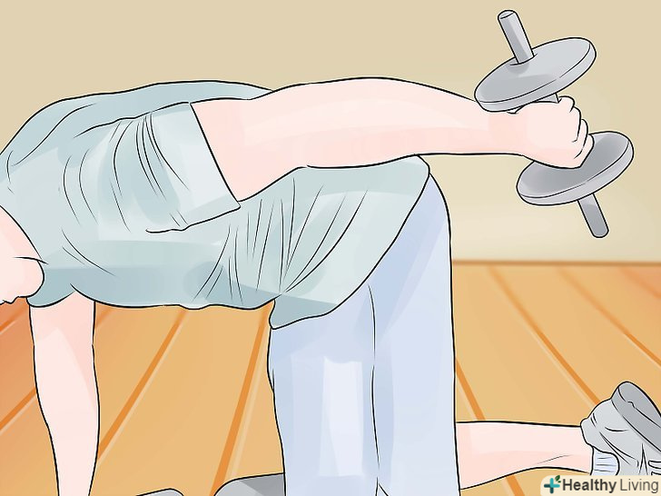 Робіть випрямлення рук з гантелями назад, стоячи в нахилі. Встаньте одним коліном на лавку. Рукою з цього ж боку упріться в лавку. Другою ногою, рівною, потрібно стояти на підлозі, а другою рукою, тримати гантелю. Руку з гантелей, зігніть в лікті під кутом 90 градусів. Потім відведіть руку назад. Повільно поверніть руку у вихідну позицію під кутом в 90 градусів. Зробіть 10 повторень. [4]