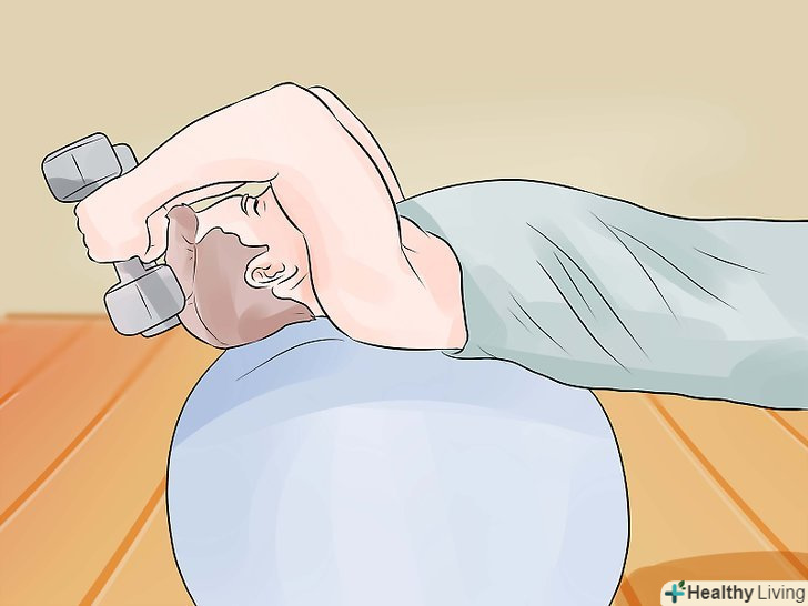 Робіть французький жим на гімнастичному м'ячі. ляжте спиною на гімнастичний м'яч. Витягніть руки; в кожній руці по гантелі. Повільно підніміть гантелі так, щоб вони були паралельні вашому лобі, потім опустіть гантелі назад на витягнутих руках. Зробіть 10 повторень цієї вправи.
