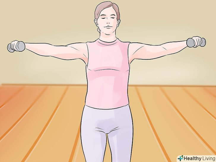 Робіть розводку рук в сторони. у цій вправі ви працюєте на дельту і покращуєте зовнішній вигляд рук і верхньої частини спини. Встаньте рівно і візьміть в кожну руку по гантелі. Злегка присядьте і і трохи розгорніть руки так, щоб мізинці були найближче до млинців гантелей. Розводите руки в сторони і вгору (як крила). Повільно опустіть руки в початкове положення і повторіть вправу. [6]