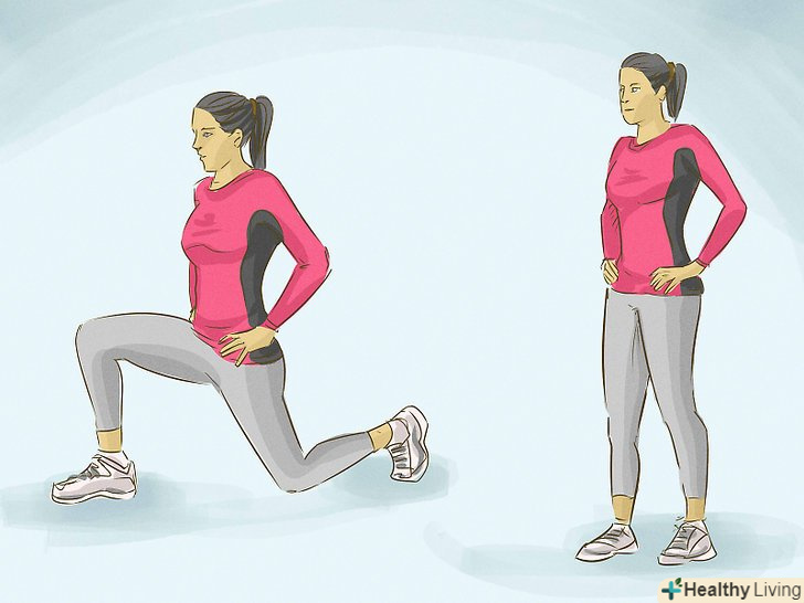 - Робіть випади вперед. Тримайте в кожній руці по гантелі, в якості обважнювача.