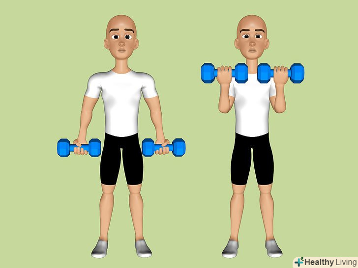 Робіть згинання рук з гантелями для накачування біцепсів і трицепсів. біцепси і трицепси є основними групами м'язів в руках, тому зосередьтеся саме на них. У положенні стоячи з ногами на ширині плечей, візьміть гантелі, розташуйте з боків, руки повинні бути розпрямлені, долоні повернені назовні. Зігніть руки і доведіть гантелі до рівня грудей і поверніться в початкове положення.- Робіть від 8 до 12 повторень, 3-5 підходів. Відпочинок між підходами повинен бути близько 45 секунд.
