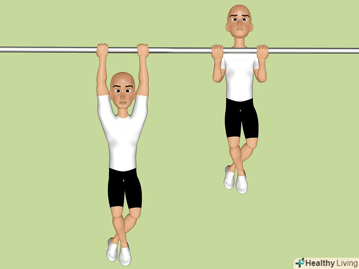 Робіть підтягування для нарощування біцепсів. Хват турніка повинен бути на ширині плечей, долонями до себе. Підтягуйтеся до підборіддя, задіюючи тільки руки. Опускайтеся вниз повільно.- Робіть від 8 до 12 повторень, 3-5 підходів.