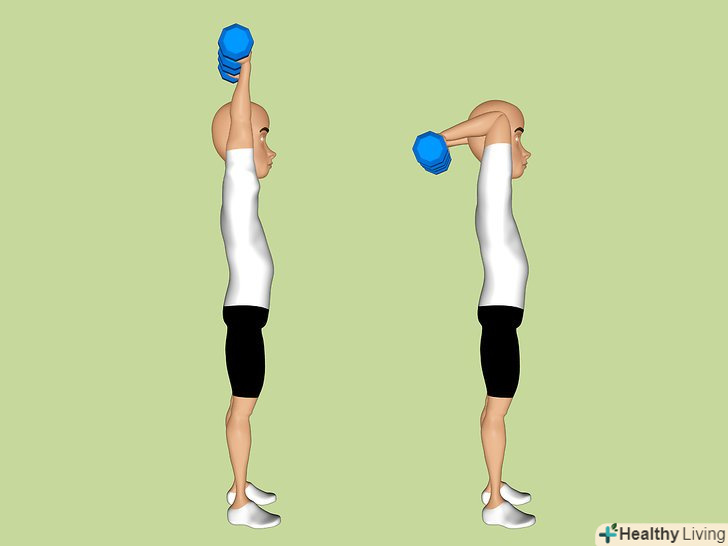 Робіть розгинання рук з гантелями для зміцнення трицепсів. у положенні стоячи з ногами на ширині плечей, гантелі тримайте над головою на витягнутих руках, долоні розгорнуті до себе. Опустіть гантелі за голову, щоб лікті були спрямовані в стелю, потім розігніть руки над головою, в початкове положення. [1]- Робіть від 8 до 12 повторень, 3-5 підходів.