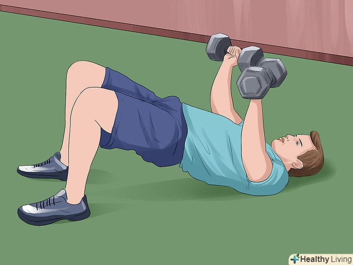 Виконуйте жим гантелей від грудей з пози сідничного містка. дана вправа допоможе вам прокачати м'язи грудей. [10] ляжте на спину і зігніть ноги в колінах. Підніміть сідниці і витягніть спину і стегна в одну лінію. Виштовхніть гантелі прямо вгору від своїх плечей. Опустіть одну руку з гантеллю таким чином, щоб плече змінило свій кут нахилу до 90 градусів і пішло в сторону, а передпліччя зберегло вертикальне положення. Рука повинна рухатися аналогічно тому, як вона рухається при відкритті дверей. Знову випряміть руку вгору і повторіть рух іншою рукою.