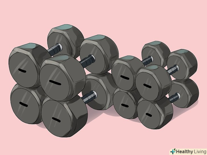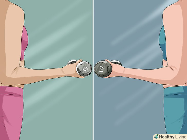 - Завжди використовуйте тільки відповідний Вам вагу. Прислухайтеся до тіла і вибирайте те, що вам потрібно. Не базуйте свій вибір на тому, яку вагу піднімають інші люди вашої статі у вашому віці. Єдина людина, з яким ви можете змагатися в піднятті гантелей, це ви самі. [4]