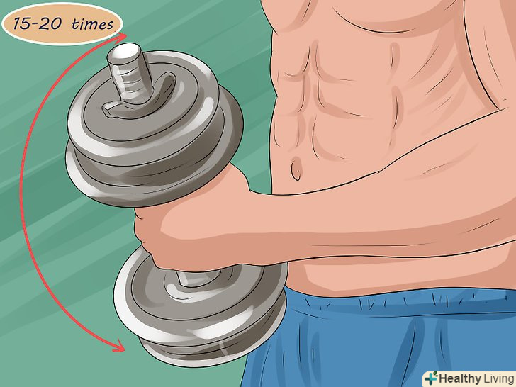 Навчіться визначати настання відповідного часу для збільшення навантаження. підібрати гантелі правильного ваги для конкретного вправи досить просто, але вам буде потрібно збільшувати навантаження в міру нарощування сили. Якщо ви вже не відчуваєте помірного або сильного напруги після виконання 14-22 повторів вправи, то настав час збільшити навантаження і взяти гантелі важче. [5] Строго стежте за тим, скільки повторів і підходів у виконанні вправи ви здатні виконати. Послідовно збільшуйте використовувану навантаження на 2-4 кг.- Якщо ви не будете підбирати вагу гантелей відповідно до своєї силою, то мало чого досягнете від роботи з вільними вагами.