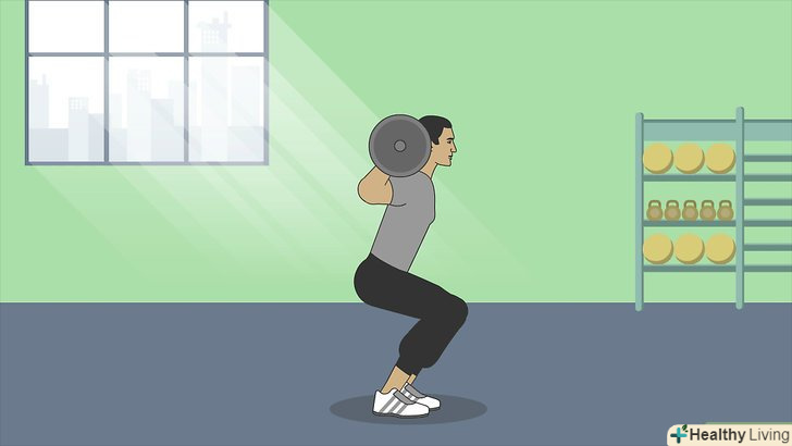 - Виконуйте присідання з гантелями. Якщо у вас худі стегна, то ця вправа якраз для вас. Присідання самі по собі добре розвивають м'язи стегон, а в поєднанні з гантелями (або штангою, якщо ви вже досить треновані) дана вправа стає ще більш ефективним. [1] почніть з тих гантелей, які ви можете підняти 10 разів без необхідності класти їх на підлогу. Для новачків підійде вага 4-8 кг. бодібілдерам для нарощування м'язів ніг потрібно піднімати більшу вагу. Виконуйте присідання наступним чином: