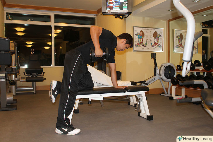 - Підйом гантелей руками: тримайте гантель в одній руці. Рука при цьому буде випрямлена, а долоню звернена всередину до себе. Розмістіть протилежну руку і коліно на гімнастичну лаву для підтримки. Підніміть гантель вгору, напружуючи м'язи спини при кожному повторенні. Дана вправа задіє верхню частину спини.