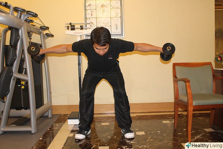 - Розводи гантелей в сторони. Тримайте гантелі руками, звертаючи долоні всередину, лікті будуть трохи зігнутими. Зігніться в поясі, розташувавши до цього ноги на ширині плечей. Використовуйте м'язи верхньої частини спини для виведення гантелей вгору і злегка назад, проробляючи свого роду кругові рухи. Повторіть цю вправу.