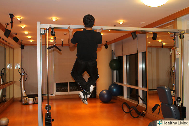 - Підтягування: схопитеся за поперечину руками зверху трохи ширше плечей. Повисіть секунду з повністю випрямленими руками. Прогніться в спині аркою і виведіть підборіддя вище поперечини. Поверніться у вихідне положення і повторіть.
