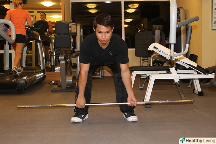 - Станова тяга. Це ефективна вправа включає в роботу відразу 3 групи м'язів. Станьте перед поперечиною штанги, зігніть ноги в колінах, не згинаючи при цьому спину. Візьміть поперечину поперемінної хваткою рук. Відірвіть вагу від підлоги шляхом розпрямлення ніг в колінах, спина залишається прямою. Тягніть свої плечі назад при виконанні кожного повторення.