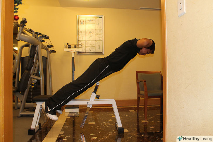 - Вправи для розтягування м'язів спини. Дане вправи розтягне і зміцнить нижній відділ спини. Розташуйте лаву під кутом 45 градусів, заберіться на неї так, що ваші стегна будуть лежати на лаві, а спина буде виходити за межі поверхні лави. Тримайте руки за головою. Нахиліться вниз, а потім поверніться у вихідне положення.