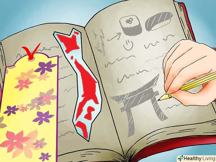 Додайте кілька малюнків. і хоча фотографії ідеально підходять для того, щоб передати, що ви бачили або зробили під час поїздки, замальовки деяких пам'яток допоможуть вам зосередитися на деталях, які ви могли упустити. Використовуйте кольорові олівці, ручки або акварельні фарби, щоб урізноманітнити записи особистою творчістю. [13]- Необов'язково бути видатним художником. Намалюйте просту карту околиць, де ви зупинялися, або симпатичний букет квітів, який побачили. Досить того, щоб малюнок допоміг вам згадати поїздки пізніше.