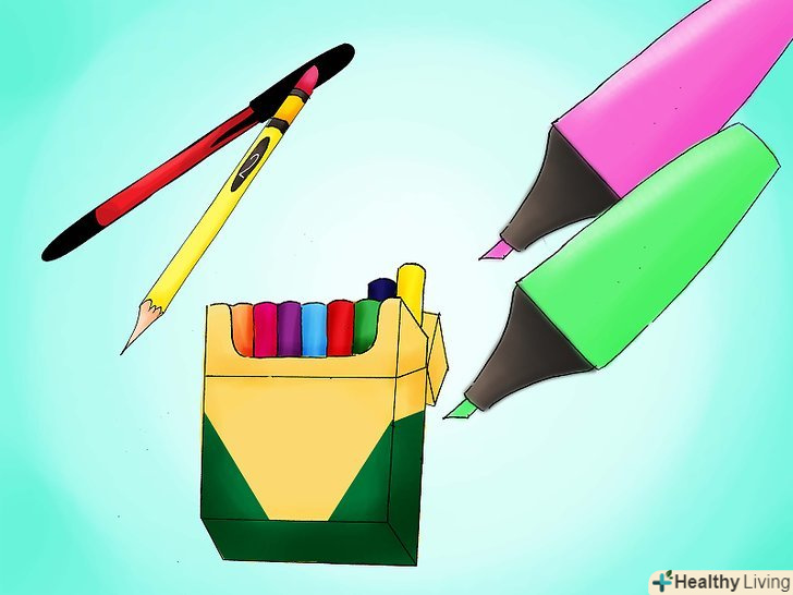 Купуйте кольорові ручки, олівці, акварельні фарби та маркери. вам знадобляться ручки, якими зручно писати, а також приналежності для замальовок побачених місць і прикраси інших матеріалів, які ви додасте в щоденник. [1]- Хороший варіант — гелеві ручки, тому що ними легко писати на більшості матеріалів. Крім того, їх виробляють самих різних кольорів.