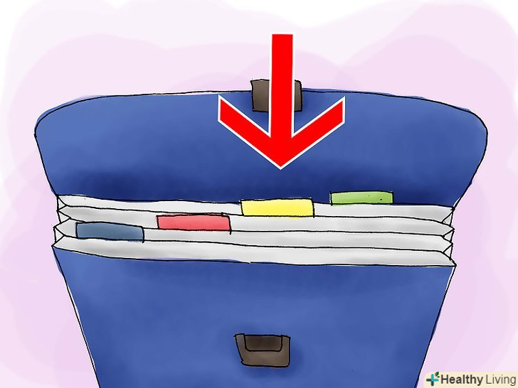 Знайдіть прозору папку-конверт. під час подорожі ви будете збирати різні матеріали, щоб додати їх в щоденник, але, можливо, вам не захочеться витрачати час на їх оформлення прямо на місці. Щоб все лежало по порядку і нічого не загубилося, візьміть з собою прозору папку-конверт і зберігайте всі пам'ятки в одному місці. [3]- Папка особливо важлива, якщо ви не хочете оформляти щоденник під час самої подорожі. Можна просто робити записи по ходу руху, а інше додати після повернення додому, так як в папці всі матеріали збережуться впорядкованими.
