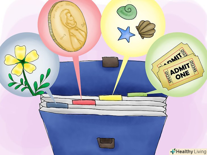 Збирайте нагадування про поїздку. з моменту, коли почнеться ваша подорож, почніть збирати матеріали, які допоможуть вести хроніку поїздки. Посадочні талони на літак, листівки, квитки в місцеві визначні пам'ятки, візитки ресторанів і готелів, паперові меню і серветки з логотипами ресторанів, вирізки з місцевих газет, етикетки від місцевих продуктів і напоїв, а також чеки покупок — все це може вдихнути життя в спогади в щоденнику. [11]- Вам необов'язково приклеювати або прикріплювати все це в щоденник під час подорожі. Просто відкладіть зібрані матеріали в папку, щоб ви могли додати їх, коли повернетеся додому. Головне, не забудьте залишати простір між записами, щоб заповнити його відповідними матеріалами.