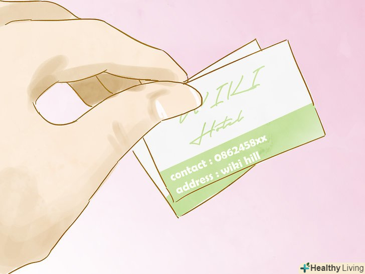 Візьміть дві візитки готелю. ніколи не знаєш, коли настане надзвичайна ситуація. Наявність візитної картки готелю забезпечить вас інформацією щодо адреси вашого проживання та контактного номера для зв'язку з готелем у разі потреби. У незнайомому місті це особливо корисно.- Зберігайте одну візитну картку на видному місці в номері, наприклад, у телефону або на нічному столику, а іншу – в гаманці або сумочці. [8]